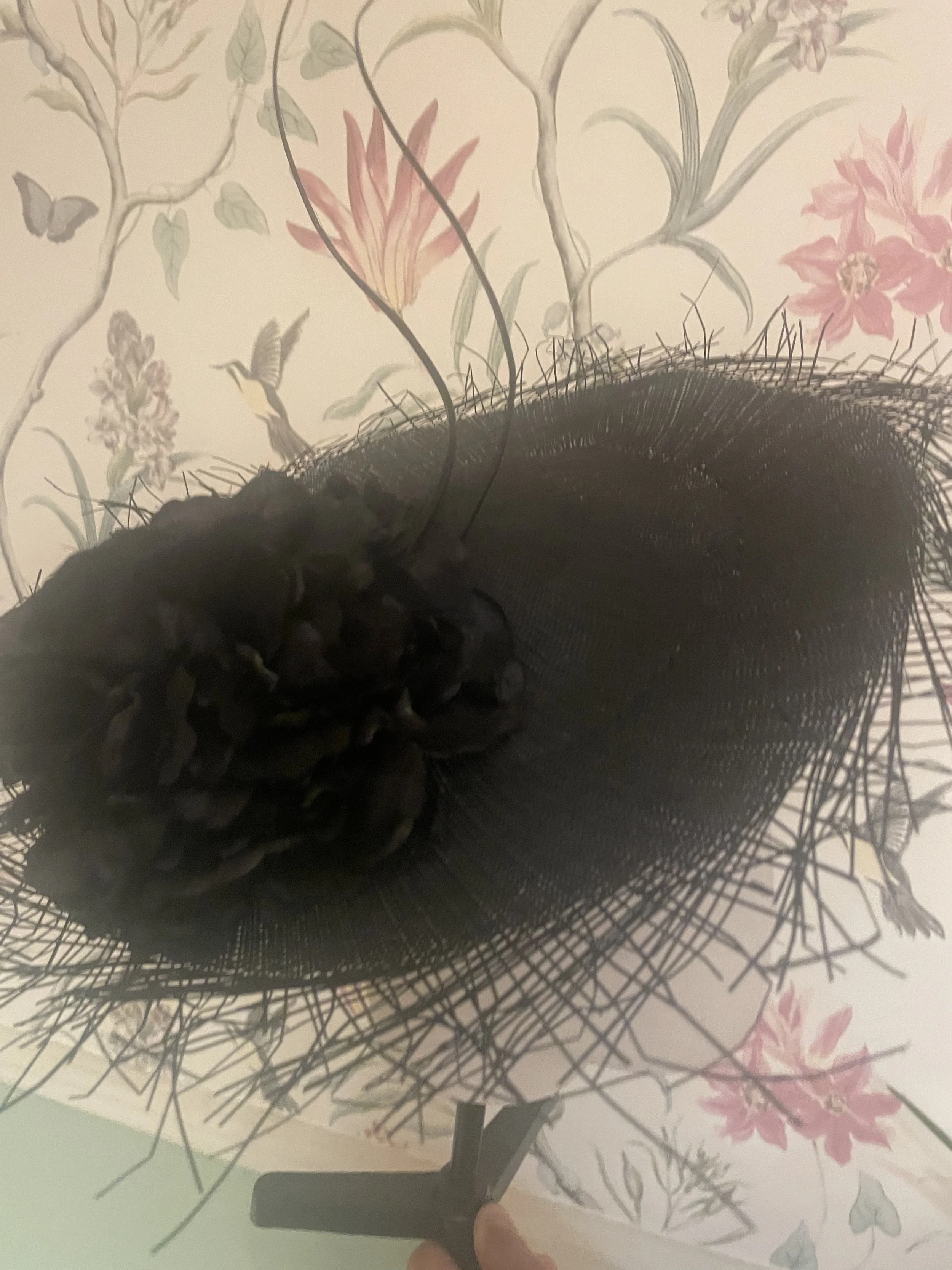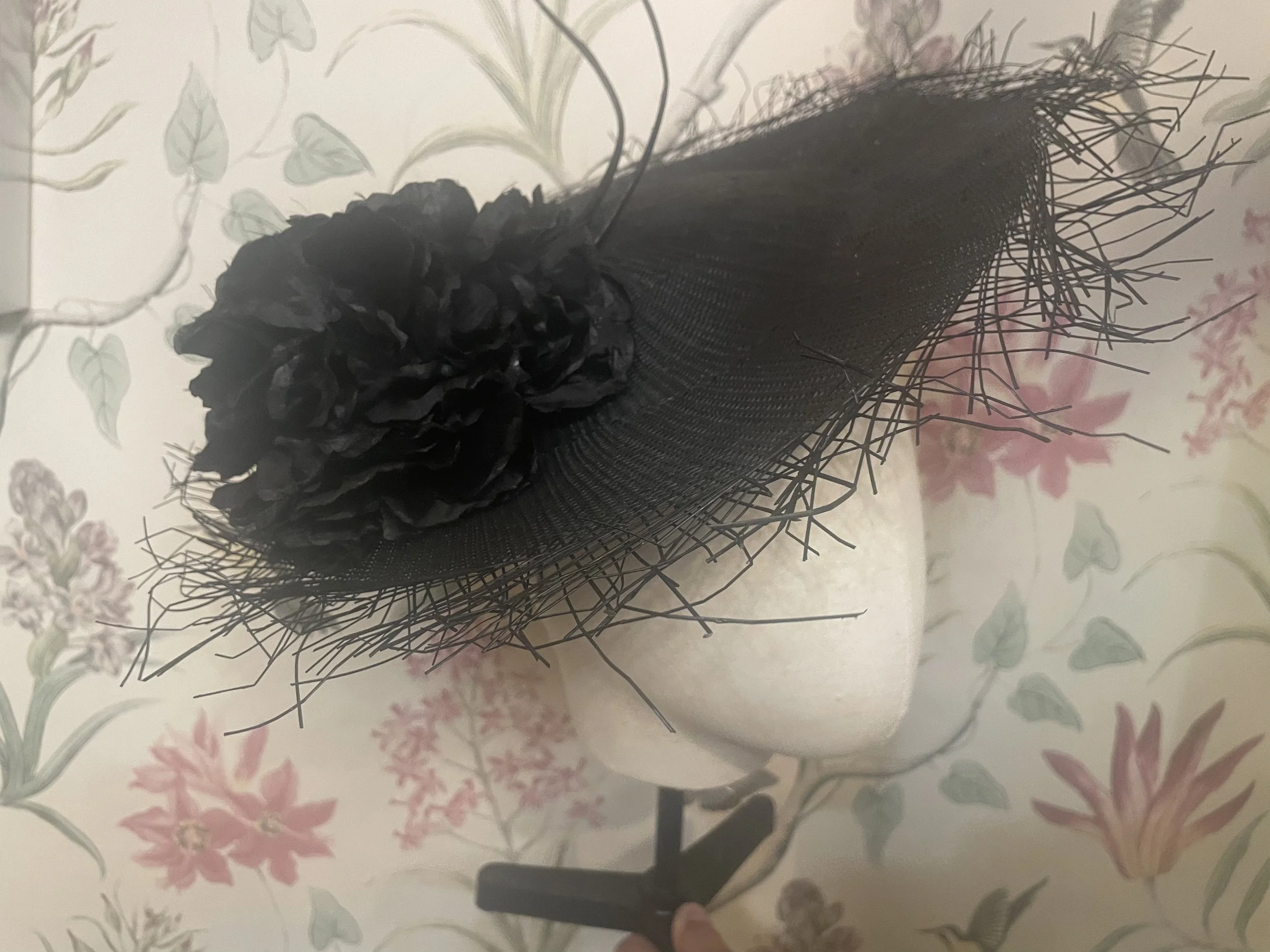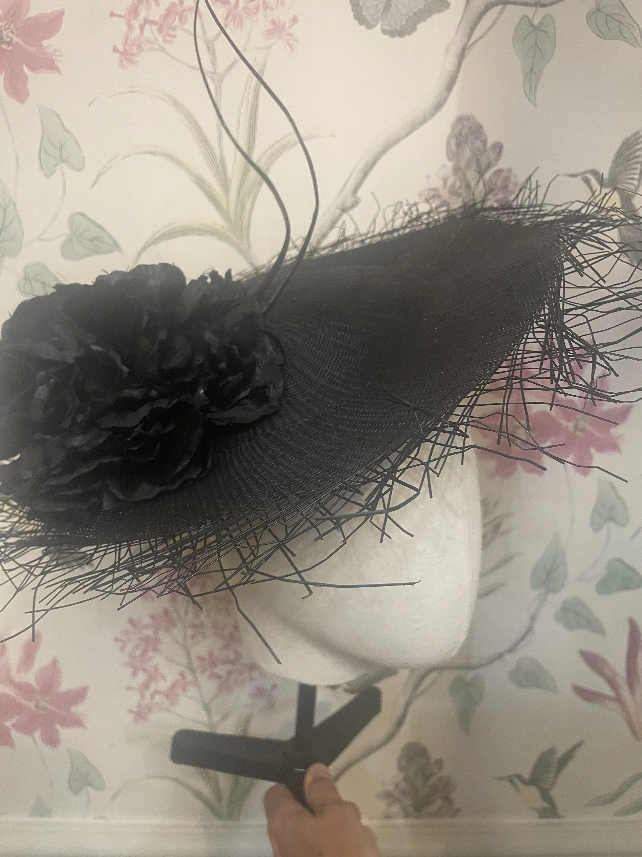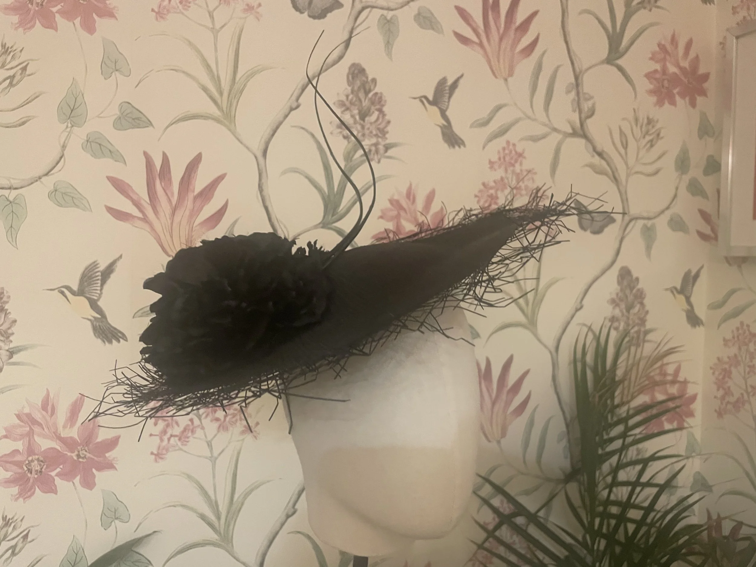 Capeline en parasisal couleur vert émeraude avec buntal naturel en tour de tête, garniture de plumes assorties. Taille 57