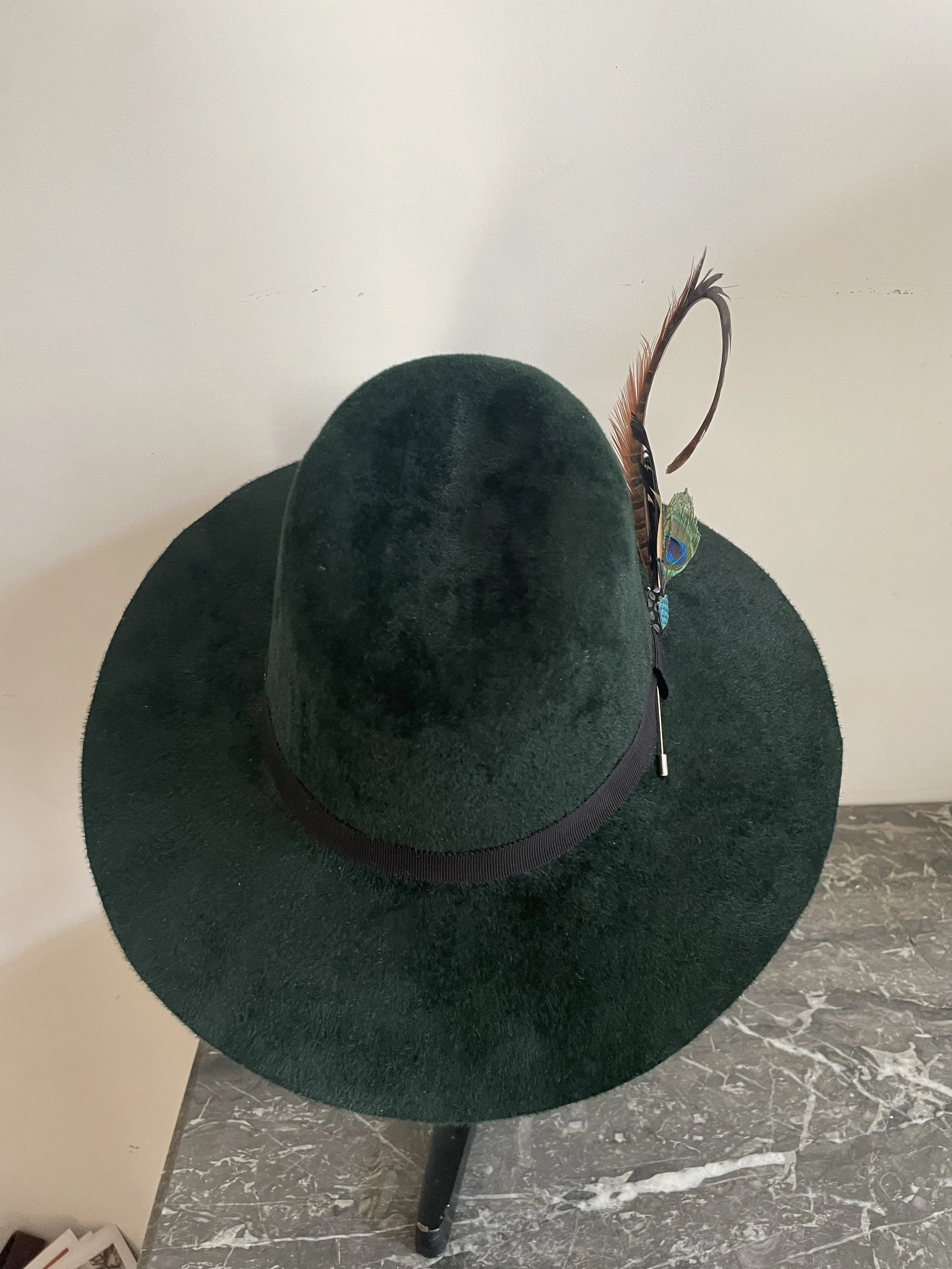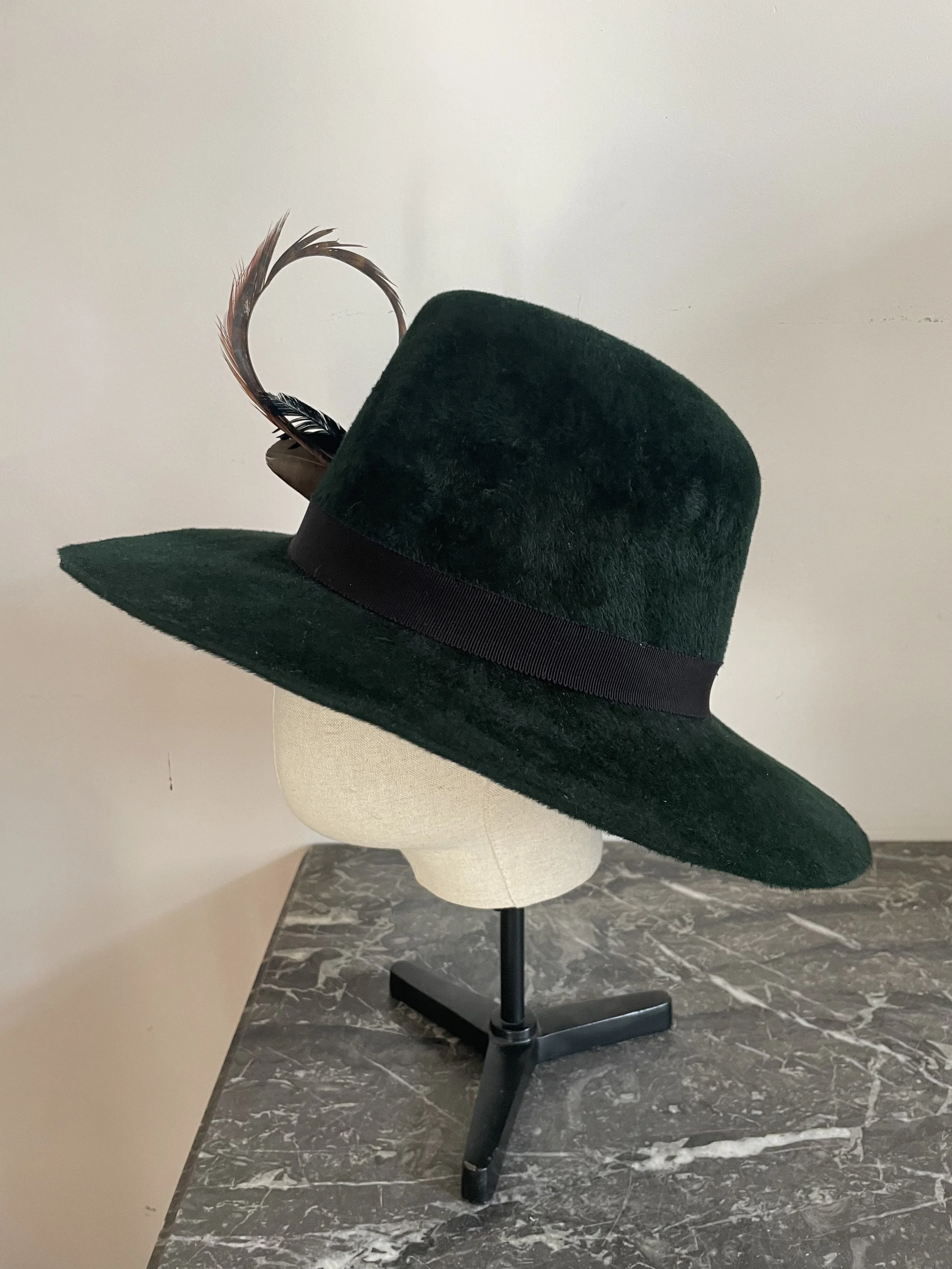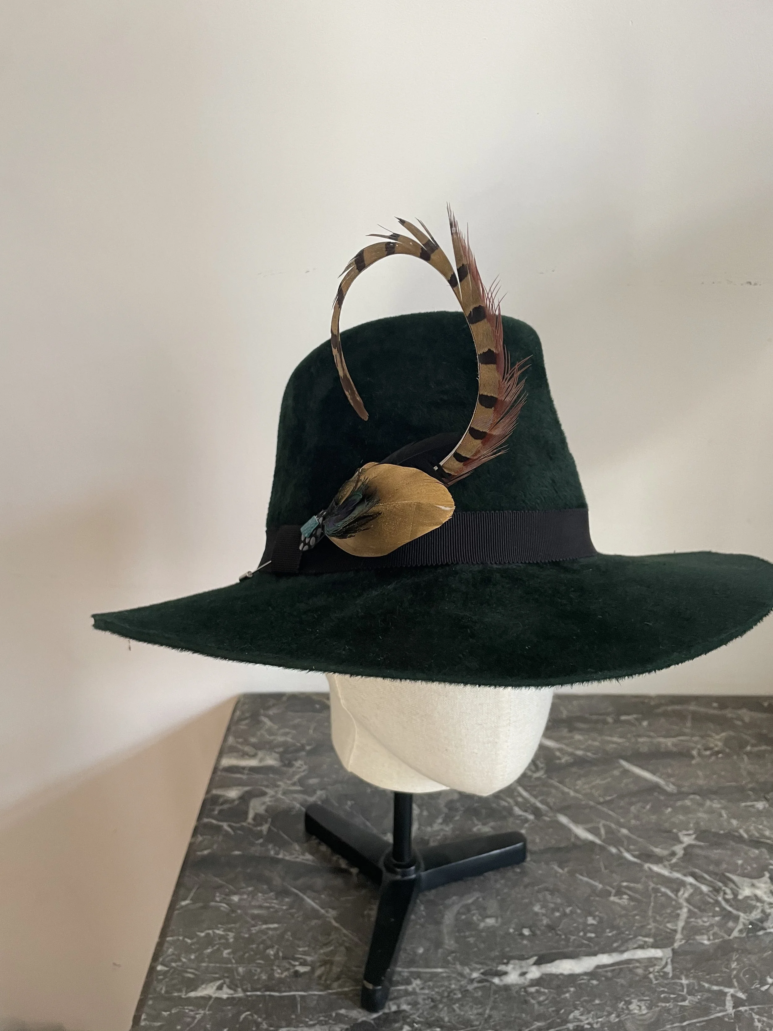 Toque asymétrique en feutre rose avec garniture de plumes roses et bleues décorées d’un strass.